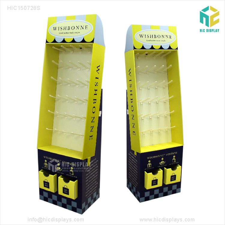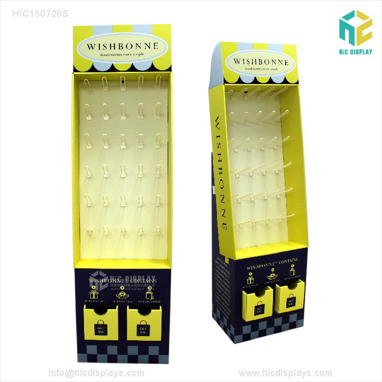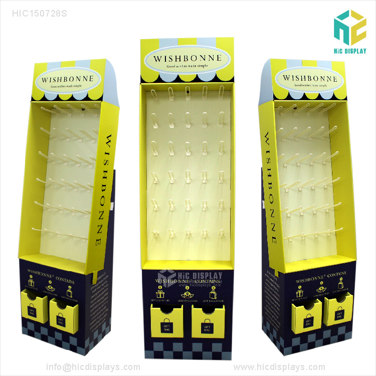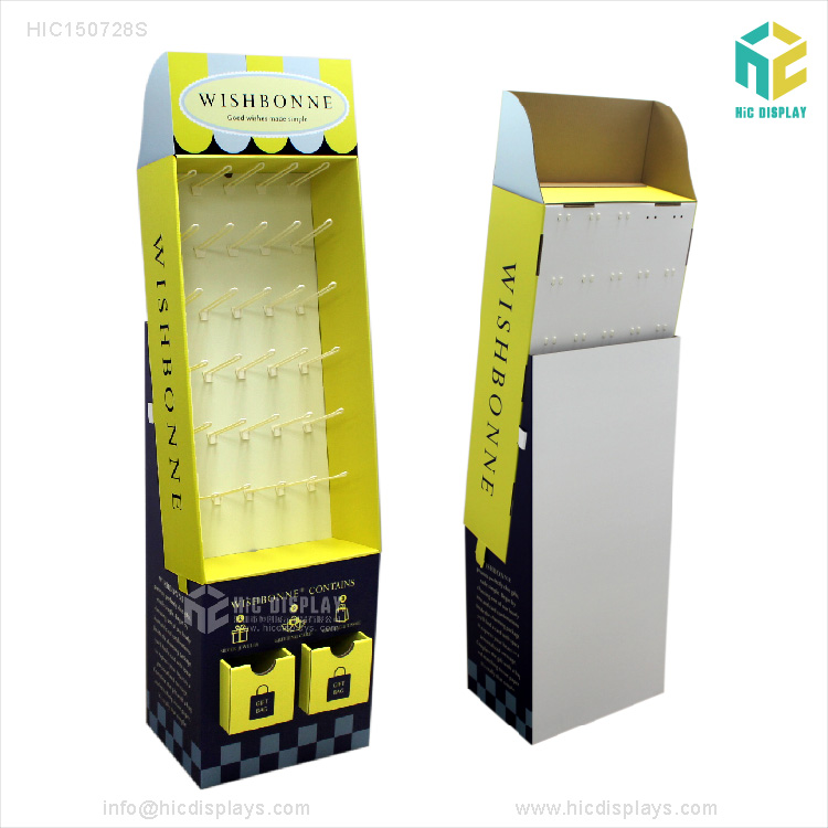 - 产品类型:商场纸货架 产品材料:优质灰卡裱高强度瓦楞纸 产品规格:按客户要求订制 产品承重:正常承重 产品工艺:彩色印刷,覆膜,裱,啤,切,粘成品 使用范围:商场,超市,专卖店商品陈列、活动促销等 所用配件:塑料挂钩30个 包装方式:打平包装,每箱一套