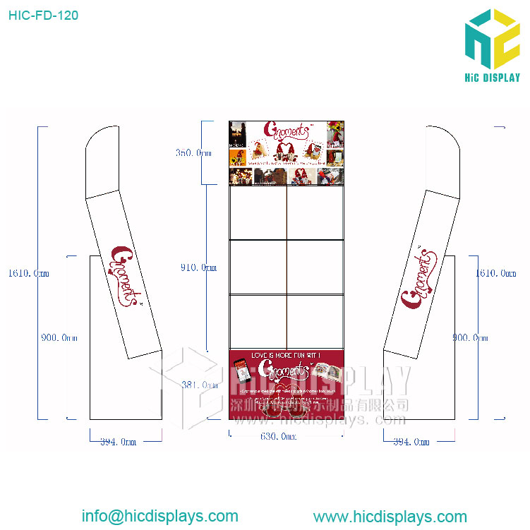 - 产品类型:商场纸货架 产品材料:优质灰卡或牛咭裱高强度瓦楞纸 产品规格:600mm*365mm*1680mm 产品承重:每层2-5Kg 产品工艺:彩色印刷,覆膜,裱,啤,切,粘成品 使用范围:商场,超市,专卖店商品陈列、活动促销等 所用配件:无 包装方式:打平包装,每箱一套。